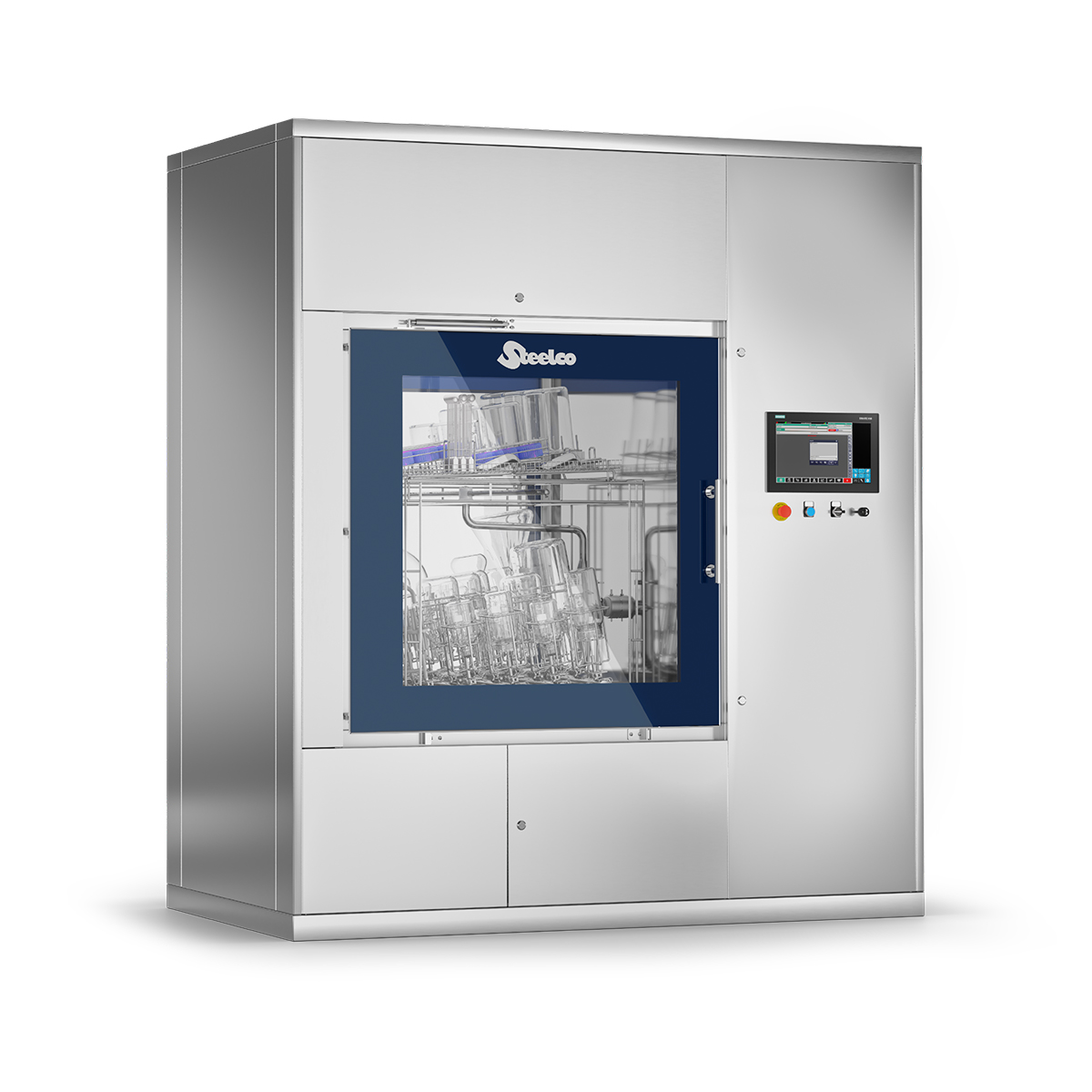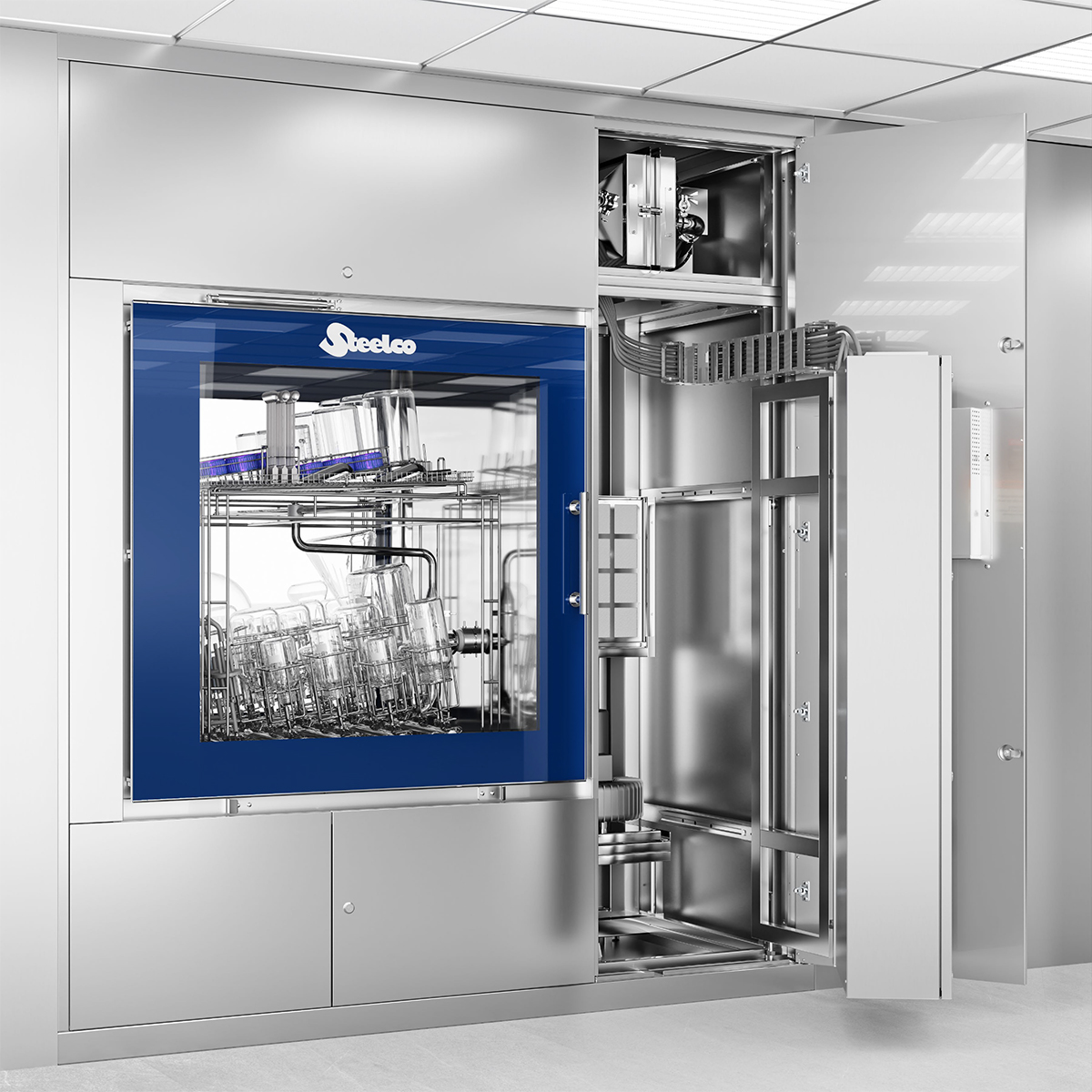 The design ensures self-cleaning of the machine chamber and pipework at each process stage, to prevent cross contamination risk. It can be configured in different layout: single or passthrough double door version with hinged full glass door. The technical area can be on right or left side. The heating elements, located in the sump, are pharma industry compliant, sanitary and dead leg free, fabricated from AISI 316L (1.4404) stainless steel and electro-polished. They may be connected to plant steam in the Steam heat exchanger version or directly to plant power in the Electrical heat exchanger version.